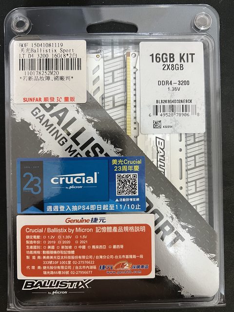 ◎硬體型號: 美光DDR4-3200 8g*2 白