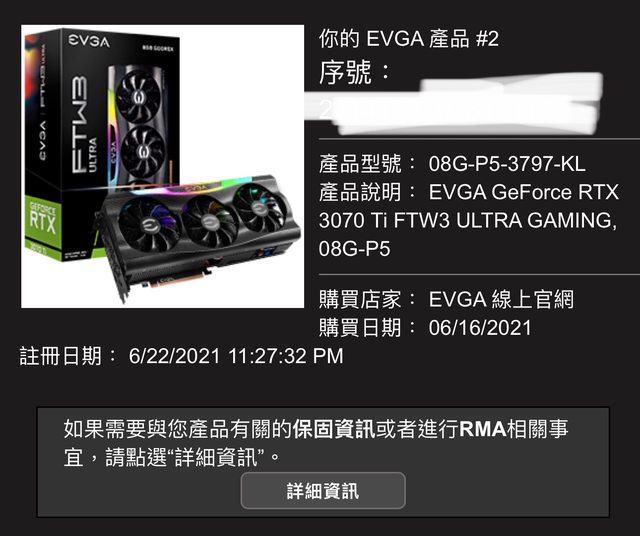 ◎硬體型號: EVGA GeForce RTX 3070 Ti FTW3 ULTRA GAMING, 08G-P5