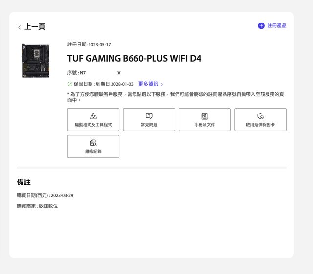 MB: TUF Gaming B660-plus Wifi D4 保固到 2028-01-03