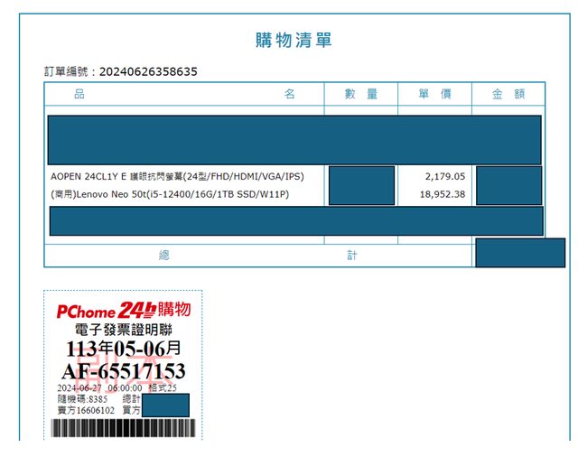 (1) 購買日期:2024/6/27 (PCHOME 下單)