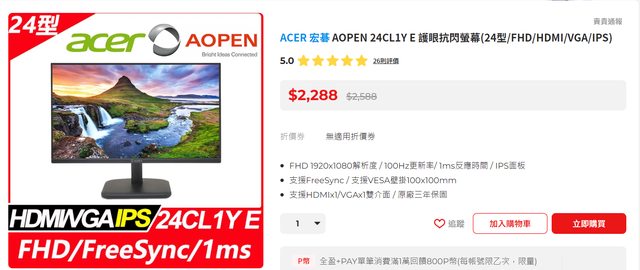 (2) AOPEN 24CL1Y E 護眼抗閃螢幕(24型/FHD/HDMI/VGA/IPS)