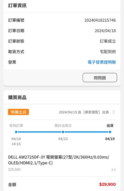 1. 購買日期:2024/4/18 pchome購入