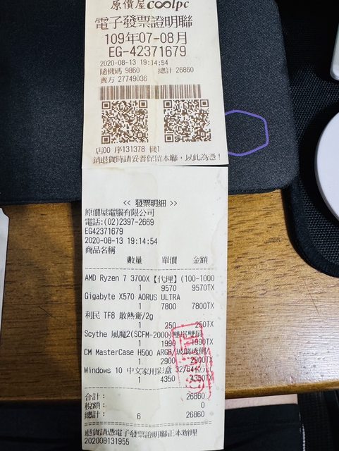 1.購買日期 : CPU 2020/8/13原價屋購入