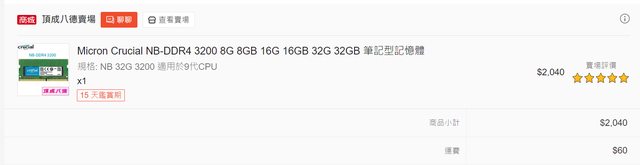 Crucial NB-DDR4 3200 32GB為2024年四月從蝦皮頂成八德賣場購入,購入後即安裝進PN42