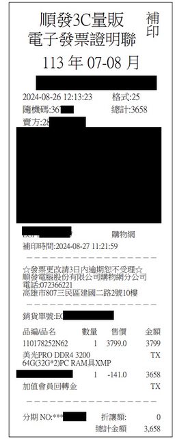 a. 8/26 順發購買,上機一周後換下改用ECC記憶體,Windows 記憶體檢查pass, 包裝為