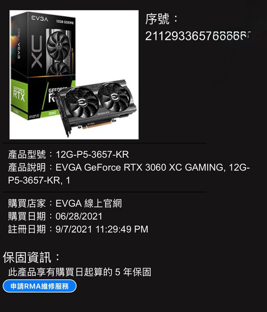 GPU : EVGA RTX-3060 (保固2026/06)