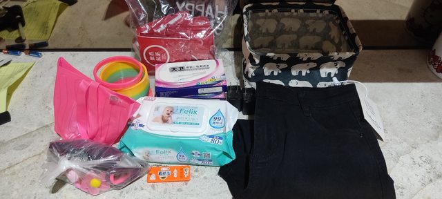 紅茶包一袋,玩具,髮圈一小袋,已開封濕紙巾,收納袋,過期排卵試紙,全新牛仔棉褲