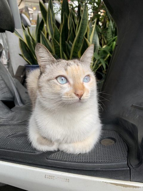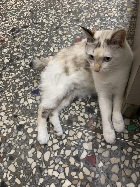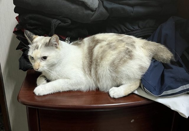 外表:白底,身體及頭部有淡淡的黑及橘色,短尾,藍眼 ,體型偏小,已結紮