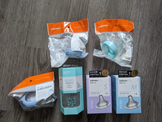 2.全新媽咪小站母感體驗寬口奶瓶120ml+全新S、M號奶嘴、替換瓶蓋、把手+消毒過的二 手奶瓶刷