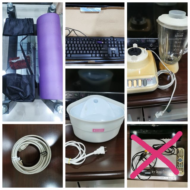 瑜珈墊、鍵盤、玻璃身果汁機、3米(應該是) 網路線、貓咪飲水機