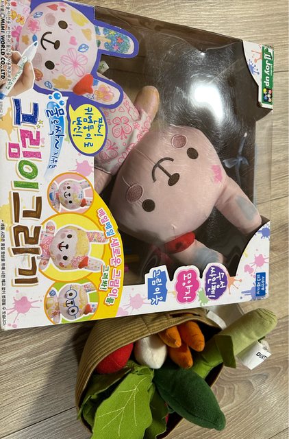 4、ikea布製蔬菜+可塗鴉的兔子玩偶,裡面筆有些沒水了,用可水洗彩色筆應可替換。玩