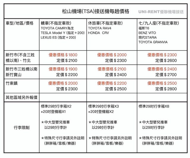 Under/多元計程車:僅可送機,無法提供接機服務(政府法令限制)。