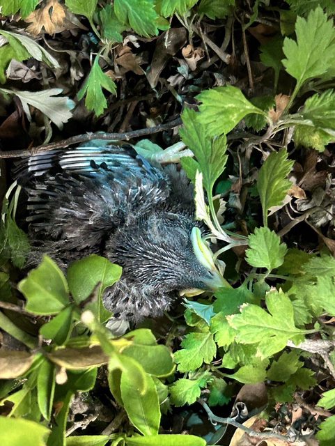 經國路三段的全國電子門外盆栽裡,發現一隻疑似掉落的亞成鳥,黃嘴黃腳,有點大隻,但