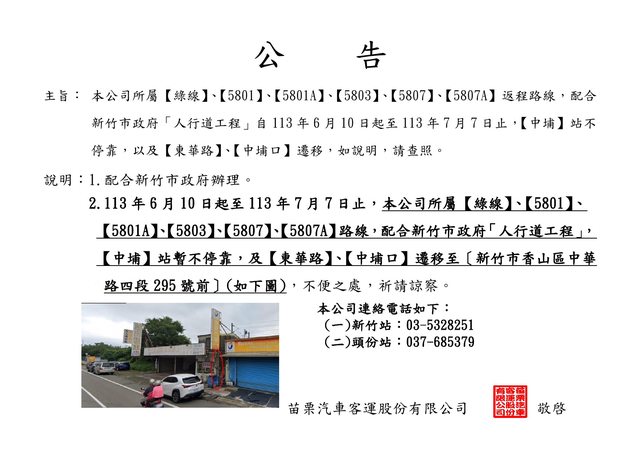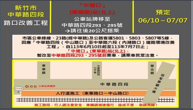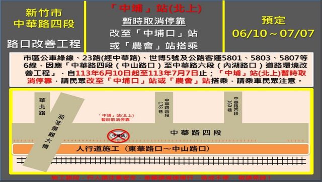 配合新竹市政府人行道工程,中埔站暫不停靠及東華路、中埔口遷移