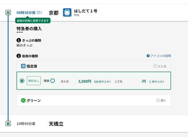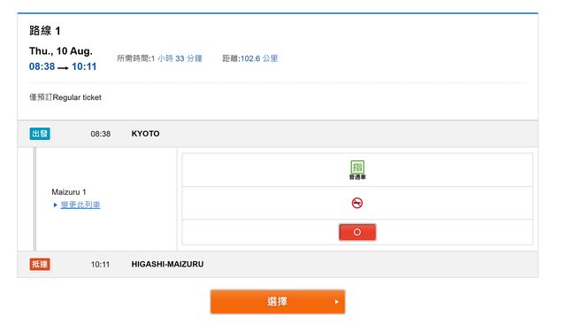 : 知道天橋立是第三鐵道部門,所以不會出現在jr車站的選單),目前只能選上午08:38發的