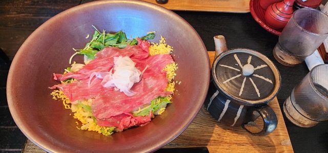 生牛肉放在烏龍麵上面,用熱高湯淋上去的瞬間十分的視覺滿滿,入口即化!另外還有販