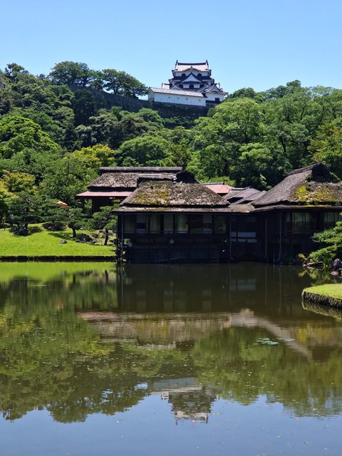 庭園也能遠看天守閣,湖面反射天守是一個很不錯的攝影點