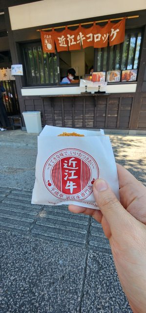 我們來到知名的近江牛可樂餅,一個牛肉餅440日幣,小貴但Juicy可以嚐嚐味道~