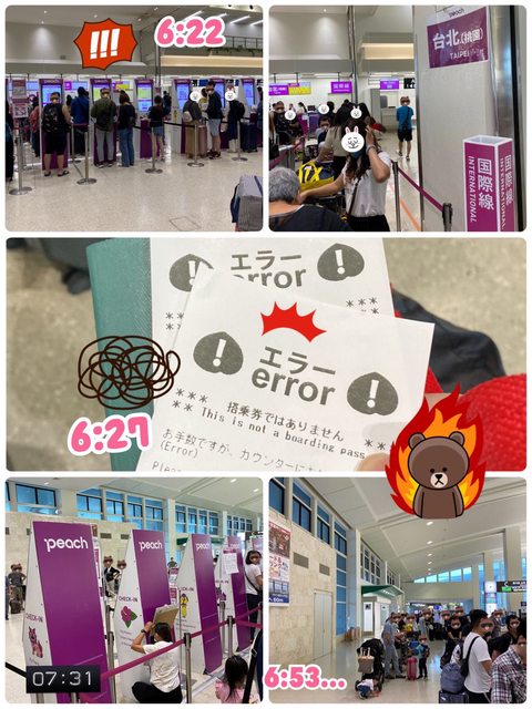 輸入了兩次自助報到機台 卻出現錯誤要前往人工櫃台報到的訊號 趕快跑去排隊人潮等