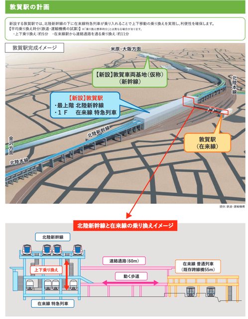 關於停靠與轉乘: * 敦賀站現有的跨線橋會透過60公尺長設電動步道的聯絡道通往新幹線車站 * 新幹線停靠新幹線車站最高層的月台,會是兩個島式月台,11~14號月台 * 特急列車(サンダーバード跟しらさぎ)會停靠新幹線車站1樓 目前預計會是兩個島式月台,一個為下車專用的31/32月台 另外一個是33停往京都大阪的サンダーバード,34停往米原名古屋的しらさぎ JR西日本表示,特急轉新幹線上下移動約需要5分鐘時間 * 其他列車(JR西日本的普通、新快速跟Hapi Line Fukui往福井方向的電車) 會停靠現在的在來線月台,JR 西日本表示轉乘約需要11分鐘 剩下原文轉貼 ※ 引述《TimeEric (艾利克)》之銘言: : JR西日本新聞稿 https://reurl.cc/EoOVG0 : JR西日本宣布 : 北陸新幹線金澤~敦賀段確定於2024年3月16日通車 : 同日JR北陸本線金澤~大聖寺移交給IR石川鐵道 : 大聖寺~敦賀移交給ハピラインふくい鐵道 : JR北陸本線僅剩米原~敦賀 : 班次數量 : 東京~敦賀かがやき、はくたか合計每天14來回 : 用來接續特急雷鳥號、白鷺號的つるぎ每天25來回 附個圖 https://i.imgur.com/g15qpGc.jpg