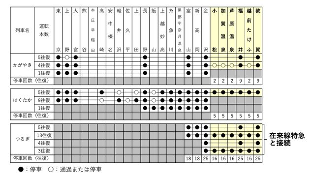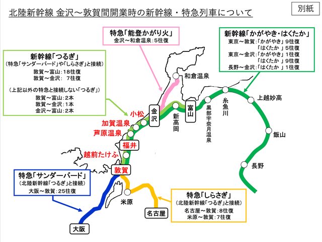 : 特急列車雷鳥號、白鷺號截短至敦賀站 : 特級恐龍星號及行駛於北陸本線的早安/晚安特快停駛 : 關東至北陸方面所需時間 : 東京~福井最快2小時51分 東京~敦賀最快3小時8分 : 關西至北陸方面所需時間,經由特急雷鳥號及新幹線 : 大阪~金澤最快2小時9分 大阪~富山最快2小時35分 : 最慘的是大阪~福井只比現在快3分卻要換車+漲價 一樣附個圖 https://i.imgur.com/dyPIDlF.jpg