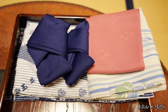 桌上擺放著玉井館的浴衣,男性的浴衣上寫著玉井館,藍色條紋配上藍色腰帶,女性則是