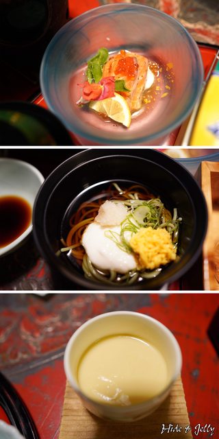 接著三道菜餚由上至下依序是,境港鮭魚親子漬、茶蕎麥麵、茶碗蒸,每一道端出來的料