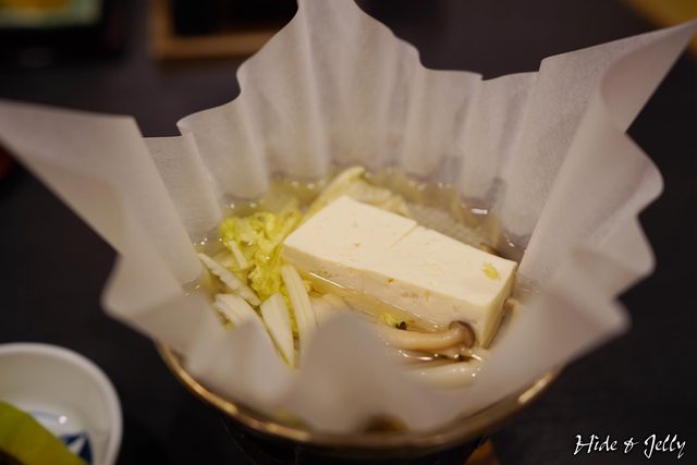 紙火鍋豆腐,搭配野菜與菇類,畫面高雅、食感豐富。
