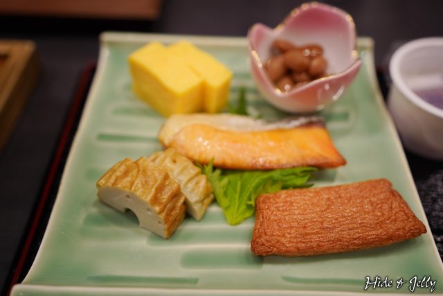 主菜盤中,有魚板、竹輪、味噌烤魚、玉子燒與漬大豆(非納豆,安心XD),每一樣都可