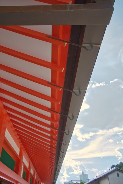 本殿附近,藍天白雲下的朱紅,讓人忍不住按快門