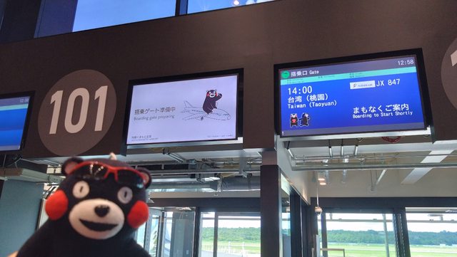 到候機空間拍了登機告示,是熊本熊搭飛機和走路的樣子,非常可愛。