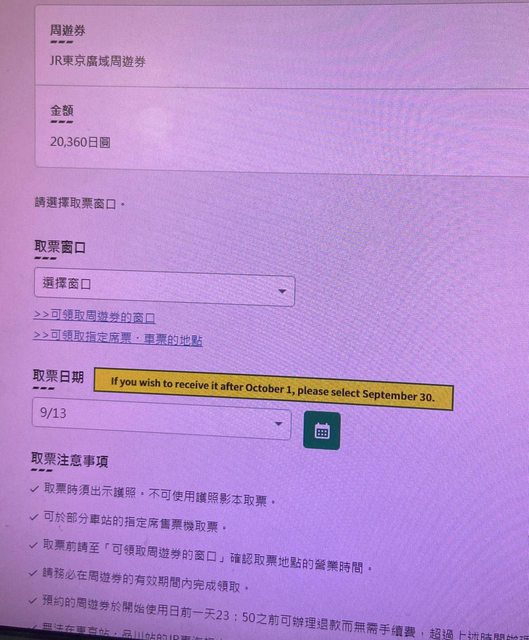 抱歉, 爬了文還是不完全了解。 預計10月9日搭機前往東京 於10/11開始使用JR東京廣域周遊3日券 官網訂購選擇取票日期 有一條特別備註 If you wish to receive it after October 1, please select September 30. 如畫面顯示 https://i.imgur.com/zJpdFsj.jpg