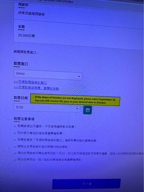 1. 出遊日期:2023/10/23-10/27 2. 每日行程:X 3. 特別希望: 大家好 小弟第一次出國 所以是菜鳥 想要問一個問題 就是10/23-27要去日本玩 這二天準備想買jr廣域周遊券 但要選擇取票日期時有人遇過這樣的狀況嗎? 我想選擇10/25上野取票 但網站說日期若不能選擇10月請選擇9/30 https://i.imgur.com/C2297zH.jpg