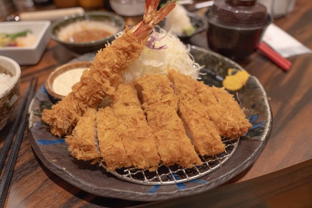 走路到AMUPLAZA吃勝烈亭(原本計畫要去新市街本店),點了六白黑豚+炸蝦的套餐(¥3960)?