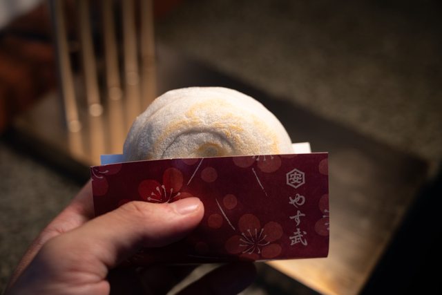 梅枝餅買一下,店員會直接拿給你,阿然後真的超燙,味道有點像外面包麻糬皮的豆沙鍋餅