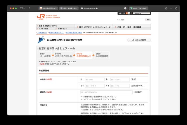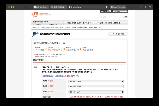7月的時候在新幹線行李架忘過一件外套有找回來 分享另一個找東西的管道,除了護照那種不立刻找到就無法繼續旅程的物品可以參考 有時候電話打不進去或是遺失物中心要排隊很久(東京駅排過1.5小時↑) 那網路表單就是一個很棒的選擇 最多人利用的東海道新幹線隸屬於JR東海 官網有個「お忘れ物お問い合わせフォーム」可以提遺失物搜尋申請 https://jr-central.co.jp/find/mail/ 在認證完email後進入填寫的頁面 https://i.imgur.com/iXi3vUW.png