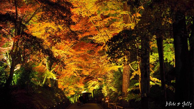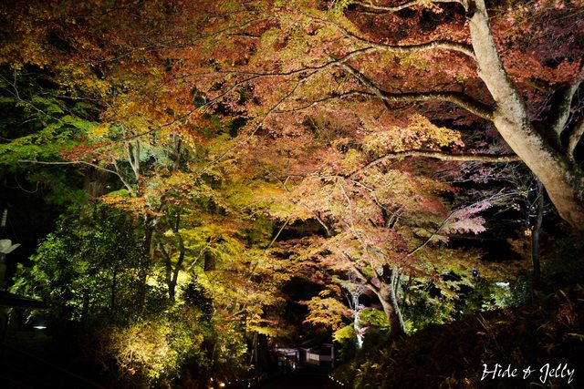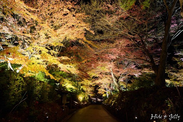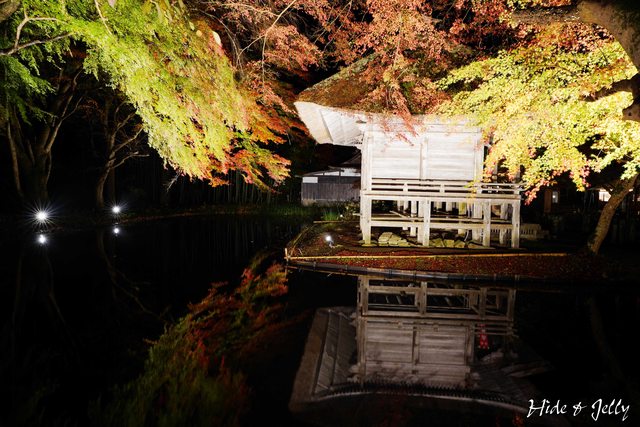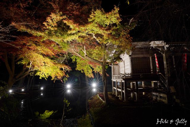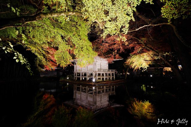 除了參道的紅葉銀河外,夜楓點燈最棒的畫面,就是弁財天堂了,這也是官網的影片中,