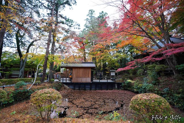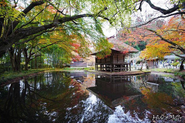 走出本堂馬上就看到「峯藥師堂」前方,那鋪滿楓葉的池子,還有周圍各種漸層的紅葉。