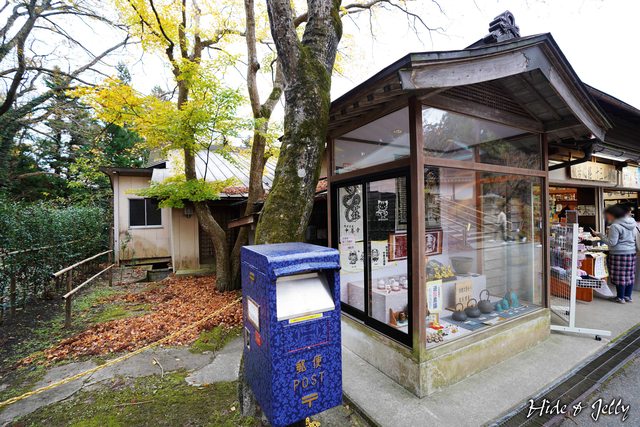快到本堂的左側,有一處「中尊寺賣店」,一旁有著特別顏色的郵筒,是使用了中尊寺國