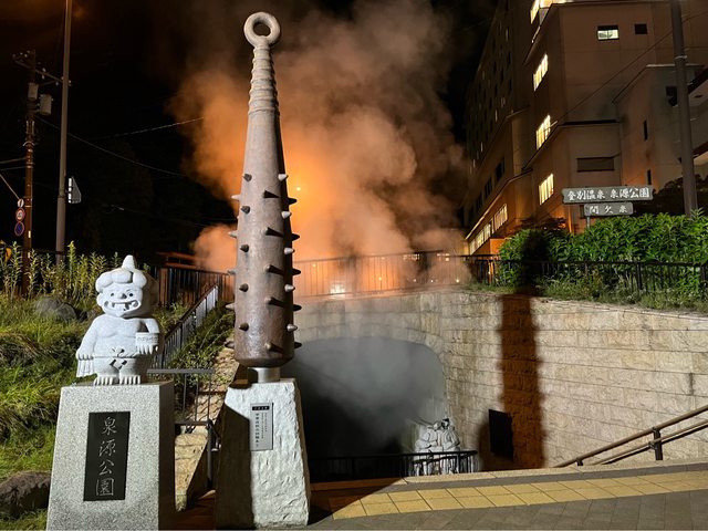 吃飽後先到飯店前方的溫泉街看閻魔王變臉秀(一天6場,晚上8、9點各一場),再去地