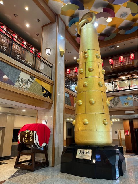 換上浴衣,先去體驗溫泉。去大浴場的途中會經過大廳9米高的大金棒及飲泉處、還算適