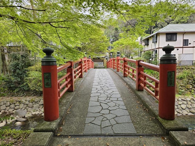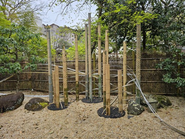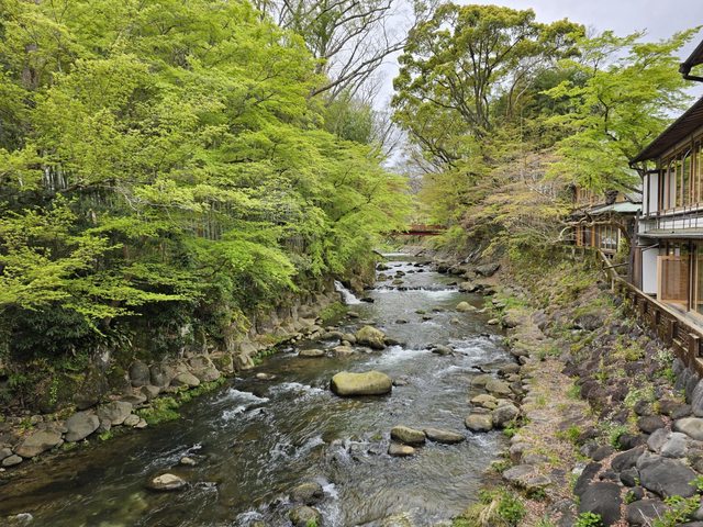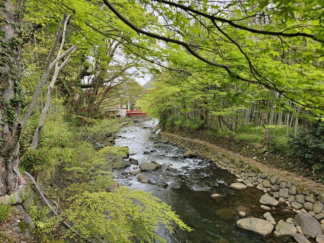 路上不少古色古香的建築,竹林小徑旁邊的赤蛙公園裡有幾株盛開的櫻花,搭配旁邊的小