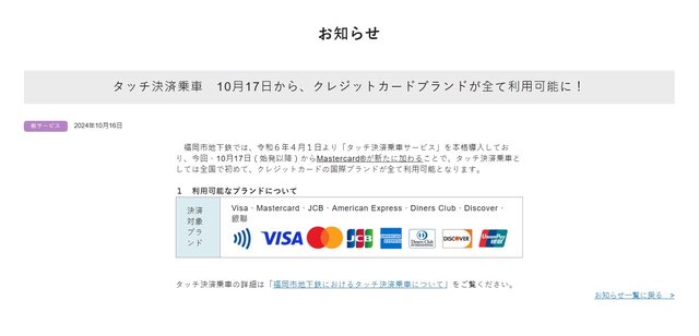 : 福岡地下鐵今天開始支援Mastercard支付方式