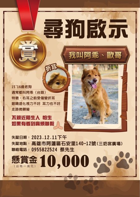 狗狗的特徵、走失細節如下圖: