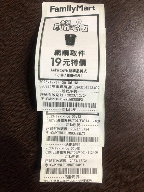 標題[贈送] 全家取件咖啡19元券*3