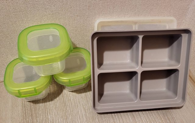 備註:大約使用4個月,灰色分裝盒有上蓋,材質也是矽膠,因裝有南瓜紅蘿蔔等的食物,故有染色現象,高標者請繞道。