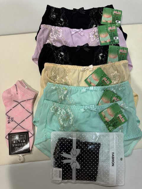 4.珍妮貝兒全新M號竹炭內褲6件+緞面絲質黑色M號內褲1件、襪子一雙