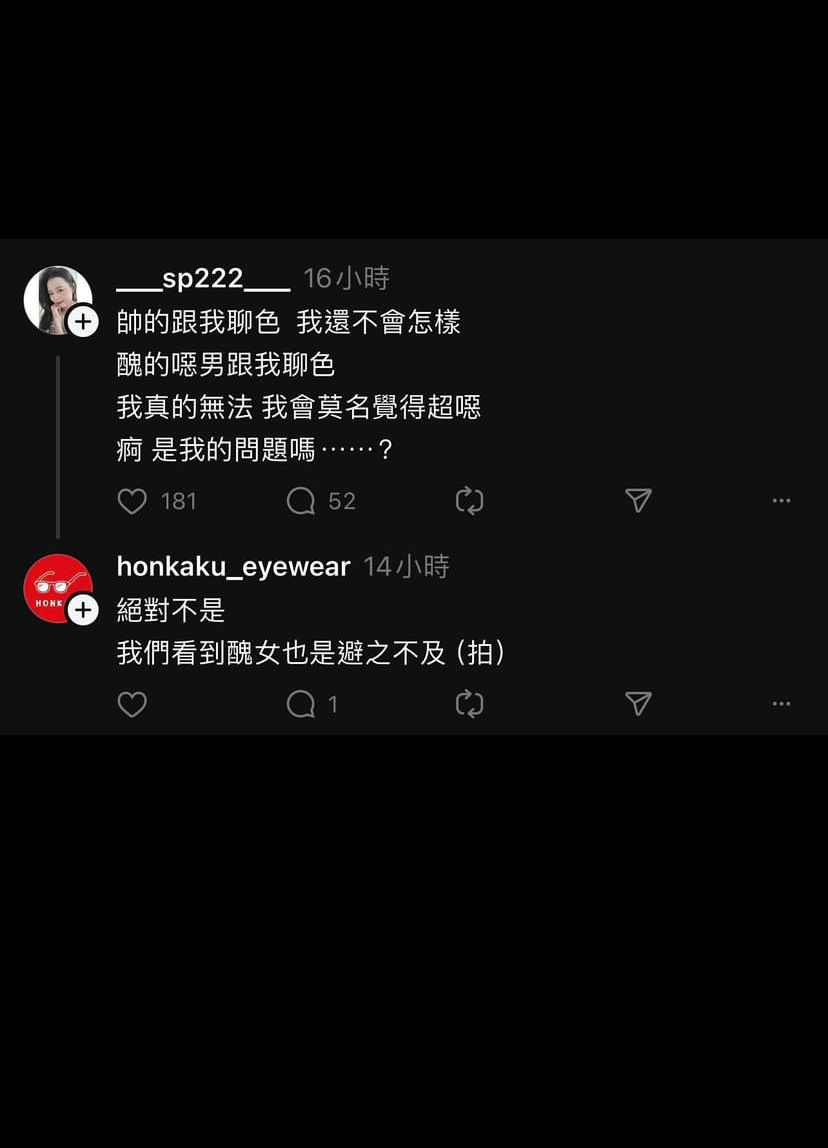→ orzkk88 : 這個眼鏡行帳號就說長輩不醜幹嘛遮03/07 19:54