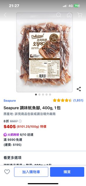 物品名稱:韓國Seapure調味魷魚腳400g一包