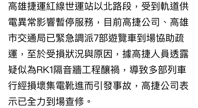 剛剛搭高雄捷運 目前發生異常 根據捷運公告 岡山車站 到青埔站 區間運行 青埔站 到世運站 接駁車運行 世運站 到小港站 區間運行 目前站務人員全部忙碌中 捷運公告說洽站務人員索取證明 但橋頭火車站站站務人員告知 目前還不能開立證明 要稍晚才可以拿到證明 https://i.imgur.com/PzpMI2s.jpeg